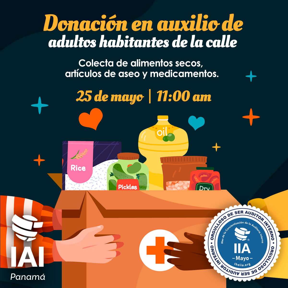 El Instituto de Auditores Internos de Panamá, comprometido también con las actividades de Responsabilidad Social (RSE), estará realizando colecta de alimentos secos, artículos de aseo y medicamentos.